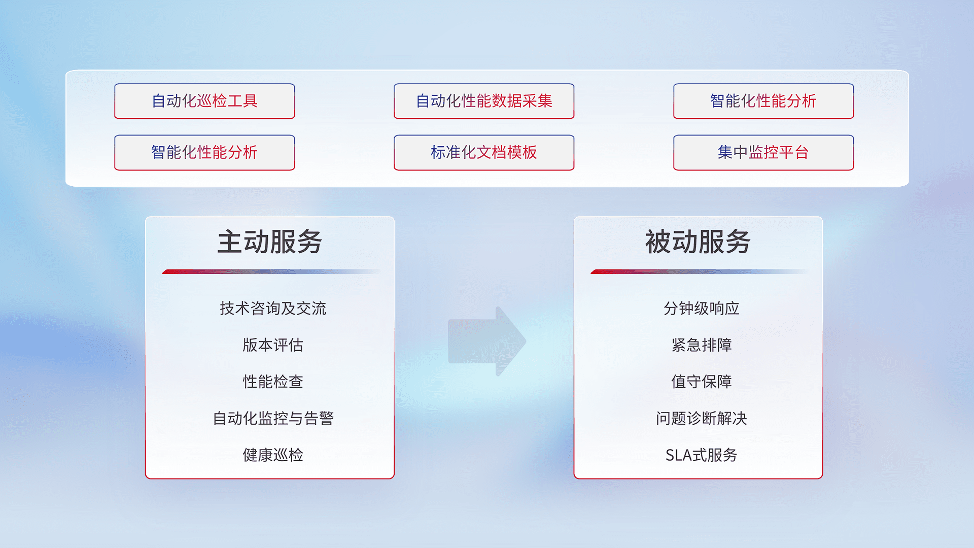 智能化工具和标准化文档,,,保障服务质量,,提供主动服务(包含技术咨询、、、版本评估、、、、性能检查、、、自动化监控与告警、、、、健康巡检)和被动服务包含(分钟级响应、、、紧急排障、、、、值守保障、、、问题诊断解决、、SLA服务)。。。。